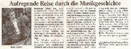 Click here for details in German of the last concert on 20. April 2007 in Makens Huus BendestorfClick here to see details in German of the last concert on 27. March 2007 in St.-Michaels-Heim Kirche BerlinClick here to see details and programme in German of the last concert on 11. March 2007 in Altes Rathaus PlaneggClick here to see details and programme in German of the last concert on 10. March 2007 in Bürgerhaus Gemeinde AlIing