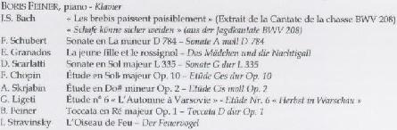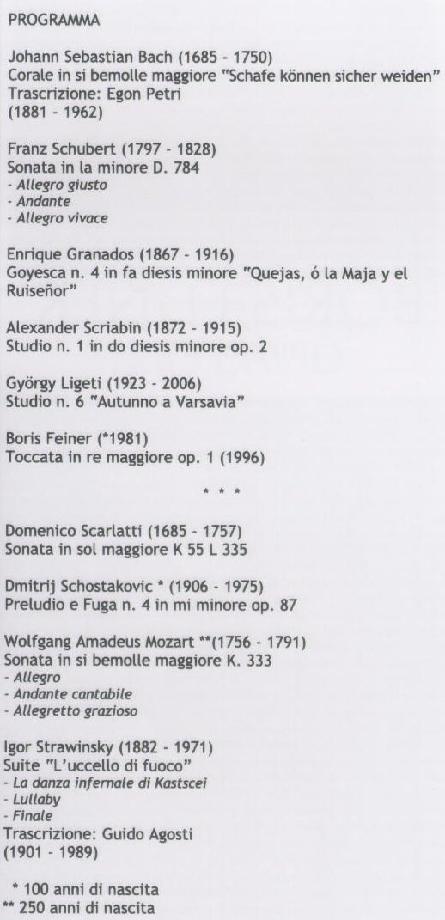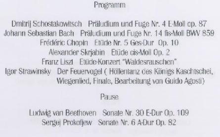 | Concertos with Orchestra Mozart: Concerto No. 20 in D minor, K. 466 Allegro Romance Allegro assai Mozart: Concerto No. 21 in C major, K. 467 Allegro maestoso Andante Allegro vivace assai Beethoven: Concerto No. 1 in C major, Op. 15 Allegro con brio Largo Rondo: Allegro Beethoven: Concerto No. 4 in G major, Op. 58 Allegro moderato Andante con moto Rondo: Vivace Mendelssohn: Concerto No. 1 in G minor, Op. 25 Molto allegro con fuoco Andante Presto Franck: Symphonic Variations Introduction: Poco Allegro – Poco più lento – Allegro – Theme and Variations: Allegretto – Interlude: Molto più lento – Finale: Allegro non troppo Rachmaninov: Concerto No. 2 in C minor, Op. 18 Moderato Adagio sostenuto Allegro scherzando Prokofiev: Concerto No. 2 in G minor, Op. 16 Andantino Scherzo: Vivace Intermezzo: Allegro moderato Finale: Allegro tempestoso General Solo Repertoire Bach: Toccata and Fugue in C minor, BWV 911 Bach: Partita No. 1 in B-flat major, BWV 825 Praeludium Allemande Corrente Sarabande Menuet I, II Gigue Bach: Prelude and Fugue in B minor, BWV 869 from the WTC, Volume I Bach: Prelude and Fugue in B minor, BWV 893 from the WTC, Volume II Bach - Petri: Chorale “Sheep May Safely Graze” in B-flat major, BWV 208 from the Hunt / Birthday Cantata Bach - Busoni: Chaconne in D minor from the Violin Sonata No. 4 Scarlatti: Sonata in D major, K. 490, L. 206 Sonata in G major, K. 55, L. 335 Mozart: Sonata in B-flat major, K. 333 Allegro Andante cantabile Allegretto grazioso Haydn: Sonata in B minor, Hob. XVI/32 Allegro moderato Menuet Finale: Presto Beethoven: Sonata No. 8 in C minor, Op. 13 "Pathétique" Grave – Allegro di molto e con brio Adagio cantabile Rondo: Allegro Beethoven: Sonata No. 15 in D major, Op. 28 "Pastoral" Allegro Andante Scherzo: Allegro vivace Rondo: Allegro ma non troppo Schubert: Sonata in A minor, D. 784 Allegro giusto Andante Allegro vivace Schubert: Sonata in A major, D. 959 Allegro Andantino Scherzo: Allegro vivace Rondo: Allegretto Schubert: Impromptu No. 3 in G-flat major, Op. 90 Impromptu No. 3 in B-flat major, Op. 142 Brahms: Sonata No. 1 in C major, Op. 1 Allegro Andante Scherzo: Allegro molto e con fuoco Finale: Allegro con fuoco Brahms: Rhapsody No. 1 in B minor, Op. 79 Brahms: Variations on a theme by Paganini, Op. 35 Schumann: Fantasiestücke Op. 12 Des Abends Aufschwung Warum Grillen In der Nacht Fabel Traumes Wirren Ende vom Lied Schumann: Sonata No. 2 in G minor, Op. 22 So rasch wie möglich Andantino: Getragen Scherzo: Sehr rasch und markiert Rondo: Presto Chopin: Grande Sonata in C minor, Op. 4 (Posthumous) Allegro maestoso Allegretto Larghetto Finale: Presto Chopin: Ballade No. 3 in A-flat major, Op. 47 Ballade No. 4 in F minor, Op. 52 Chopin: Fantasy in F minor, Op. 49 Chopin: Scherzo No. 3 in C-sharp minor, Op. 39 Chopin: Nocturne No. 5 in F-sharp major, Op. 15, No. 2 Chopin: Polonaise No. 6 in A-flat major, Op. 53 "Heroic" Chopin: Etude No. 3 in E major, Op. 10 Etude No. 5 in G-flat major, Op. 10 Etude No. 1 in A-flat major, Op. 25 Etude No. 7 in C-sharp minor, Op. 25 Rachmaninov: Etude-tableau No. 2 in A minor, Op. 39 Etude-tableau No. 6 in A minor, Op. 39 Rachmaninov: Prelude No. 6 in E-flat major, Op. 23 Prelude No. 12 in G-flat major, Op. 32 Scriabin: Etude No. 1 in C-sharp minor, Op. 2 Debussy: Etude No. 7 "Pour les degres chromatiques" Debussy: Prelude "...La terrasse des audiences du clair de lune" Ligeti: Etude No. 6 "Automne à Varsovie" Etude No. 11 "En Suspens" Liszt: Concert-Etude "Waldesrauschen" in D-flat major Liszt: Polonaise No. 1 in C minor Granados: Goyescas - Los Majos Enamorados (The Majos in Love) Los Requiebros (Flattery) El Fandango de Candil (The Fandango by Lamplight) Quejas, ó la Maja y el Ruiseñor (Laments, or Maiden and Nightingale) El Amor y la Muerte: Balada (Love and Death: Ballade) Prokofiev: Sonata No. 6 in A major, Op. 82 Allegro moderato Allegretto Tempo di valzer lentissimo Vivace Shostakovich: Prelude and Fugue in E minor, Op. 87 Volume I Ginastera: Suite de Danzas Criollas Adagietto pianissimo Allegro rustico Allegretto cantabile Calmo e poetico Scherzando Coda: Presto e energico Stravinsky – Agosti: “The Firebird” The Infernal Dance of King Kashchei Lullaby Finale Borodin – Blumenfeld: Polovetskian Dances from "Prince Igor" Dance of the Polovetskian Maidens The Girls’ Lively Dance – The Men’s Wild Dance, Group and Women Slaves’ Dances – Boys’ and Men’s Dances Girls’ Lively and Slow Dances, Boys’ Fast Dance – Boys’ and Men’s Dances – Group Dance – Coda